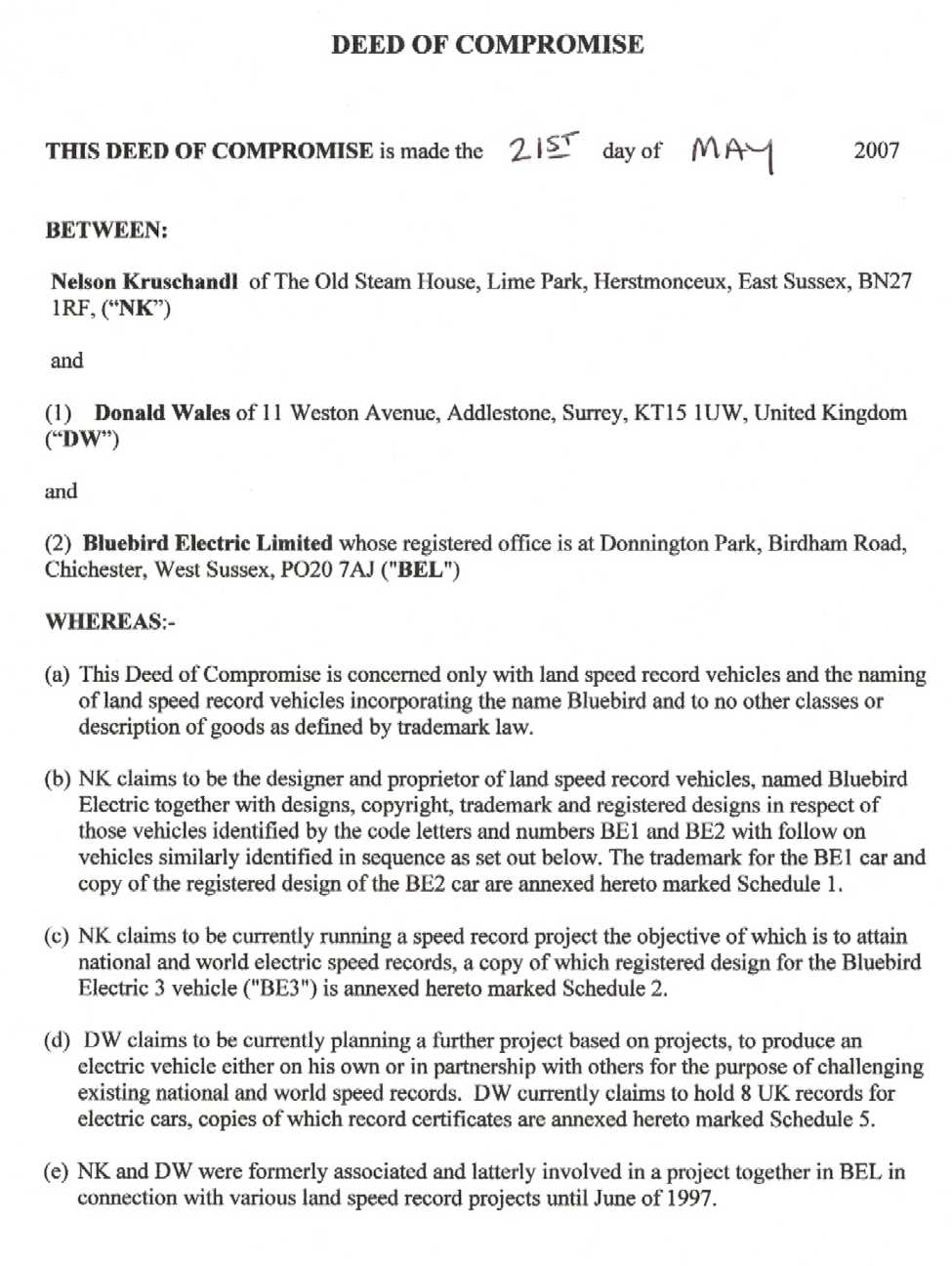 Following this email, Don Wales sent the Private 'Deed of Compromise' by special delivery number ZV 4994 2309 6GB to Mr Kruschandl, duly signed. This is the envelope that the document was received in. The handwriting is clearly that of Donald Wales, as anyone who knows his writing will attest to. Kruschandl was not consulted about the transfer and would not have agreed to the transfer of ownership without being notified well in advance and thereafter re-negotiating key issues. He alleges that transferring the ownership from the protection of the Malcolm Campbell Heritage Trust, would be bound to cause him difficulties.